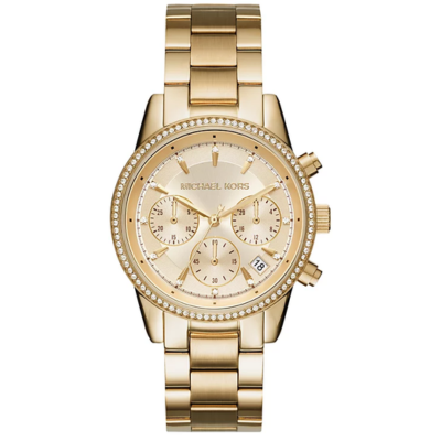 Style #:MK6356 A pavé crystal topring and crystal-accented indexes add a feminine finishing touch to the menswear-inspired gold-tone Michael Kors Ritz watch. A classic three-link bracelet and champagne textured chronograph dial with date window complete this stylish-yet-functional watch. Case Size: 37 mmCase Thickness: 11 mmBand Width: 18 mmWater Resistant:  5 ATMClosure: Bracelet Deployant