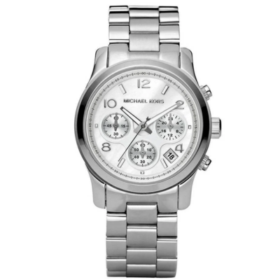 Understated chic is at the heart of this sleek silver-tone stainless steel Michael Kors chronograph.