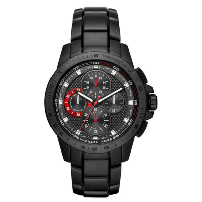 Add a dash of distinction to your wardrobe with the dynamic Michael Kors Ryker watch. The textured black-and-red aviator-inspired chronograph dial is accented by a black IP case, tachymeter topring and three-link bracelet.